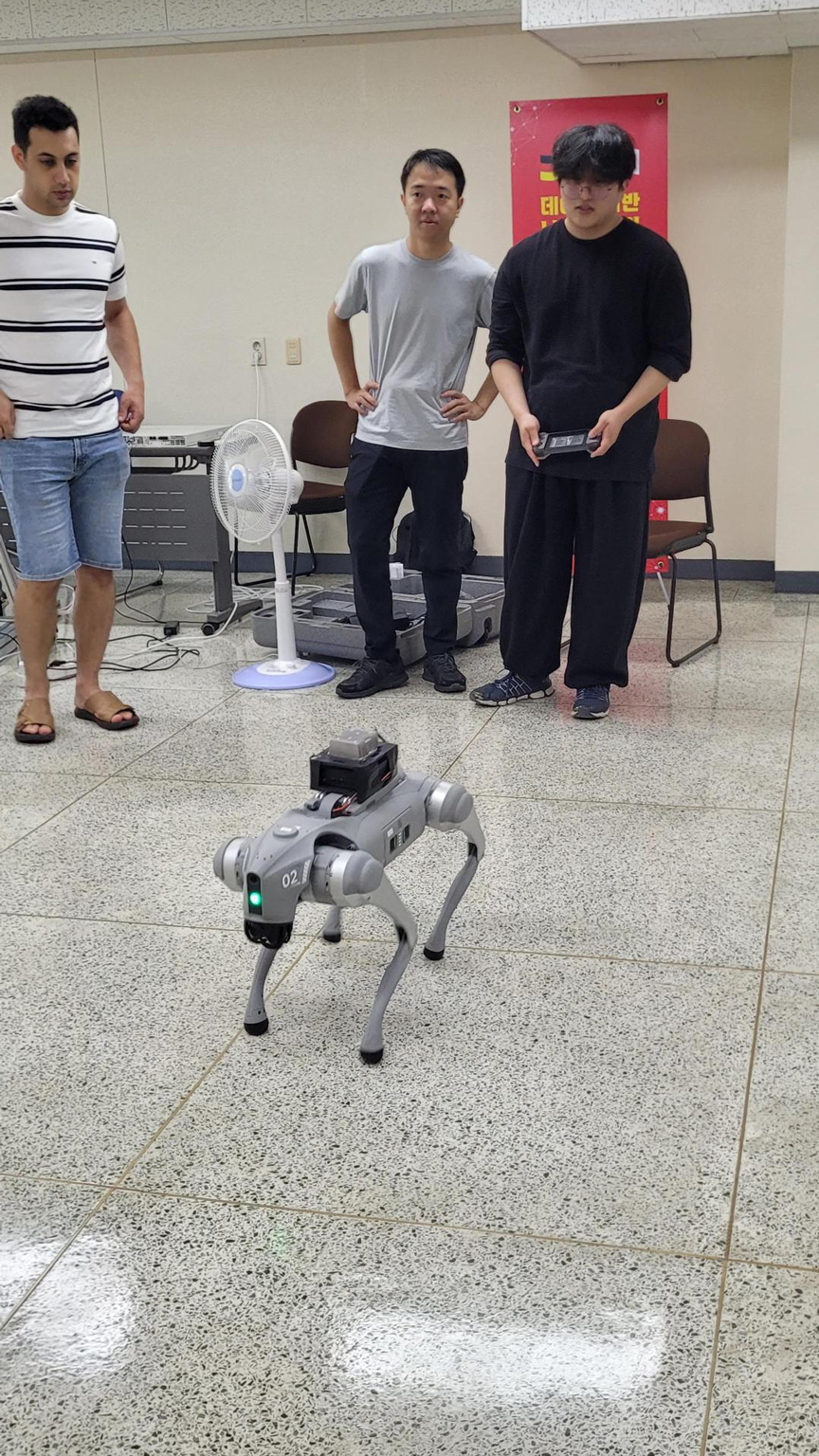 4족보행 로봇 데모로 많은 학생들의 시선을 사로잡았습니다. 마치 살아있는 것처럼 움직이는 로봇 개에 학생들은 탄성을 자아냈습니다. 아래 사진은 허필원 교수님 연구실의 학생들이 4족보행 로봇을 조작하는 모습입니다.