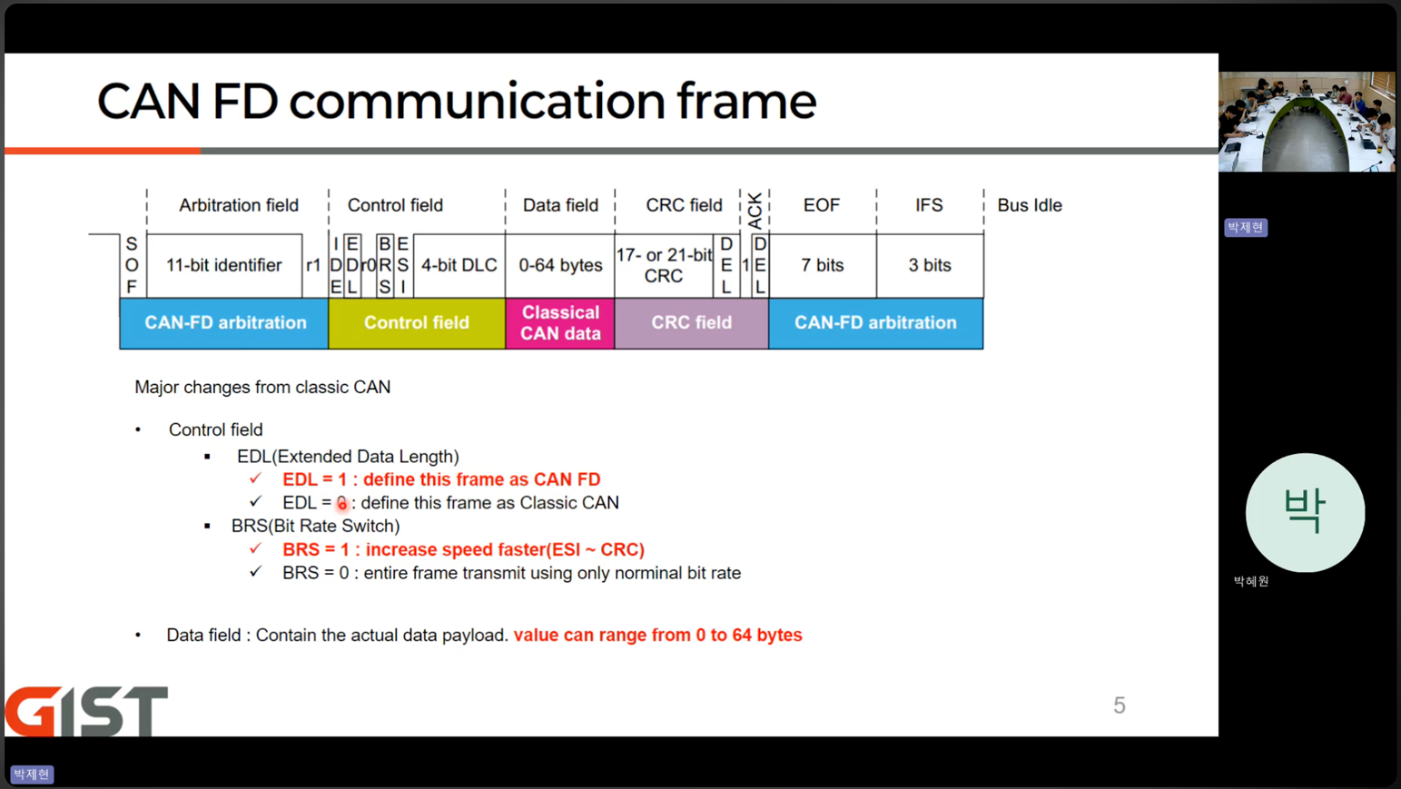 이번 학기 첫 JC에서는 석사과정 박제현 학생이 연구 과제에서 모터 제어에 사용할 CAN-FD(Controller Area Network with Flexible Data-rate) 통신 프로토콜에 대해 발표했습니다. CAN-FD는 기존 CAN 프로토콜보다 더 빠른 데이터 전송 속도와 더 큰 페이로드를 제공하여, 정밀한 모터 제어가 필요한 웨어러블 로봇 연구에 핵심적인 기술입니다. 신입생들도 함께 참여하며 활발한 질의응답이 오갔습니다.