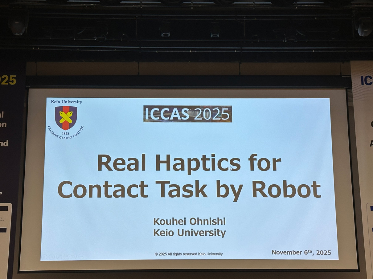 이번 학회의 여러 기조강연 중에서도 특히 인상 깊었던 것은 Plenary Lecture 3로 진행된 Prof. Kouhei Ohnishi 교수의 강연이었습니다. 강연 제목은 "Real Haptics for Contact Task by Robot"으로, 로봇의 접촉 작업을 위한 햅틱스 기술에 관한 내용이었습니다.