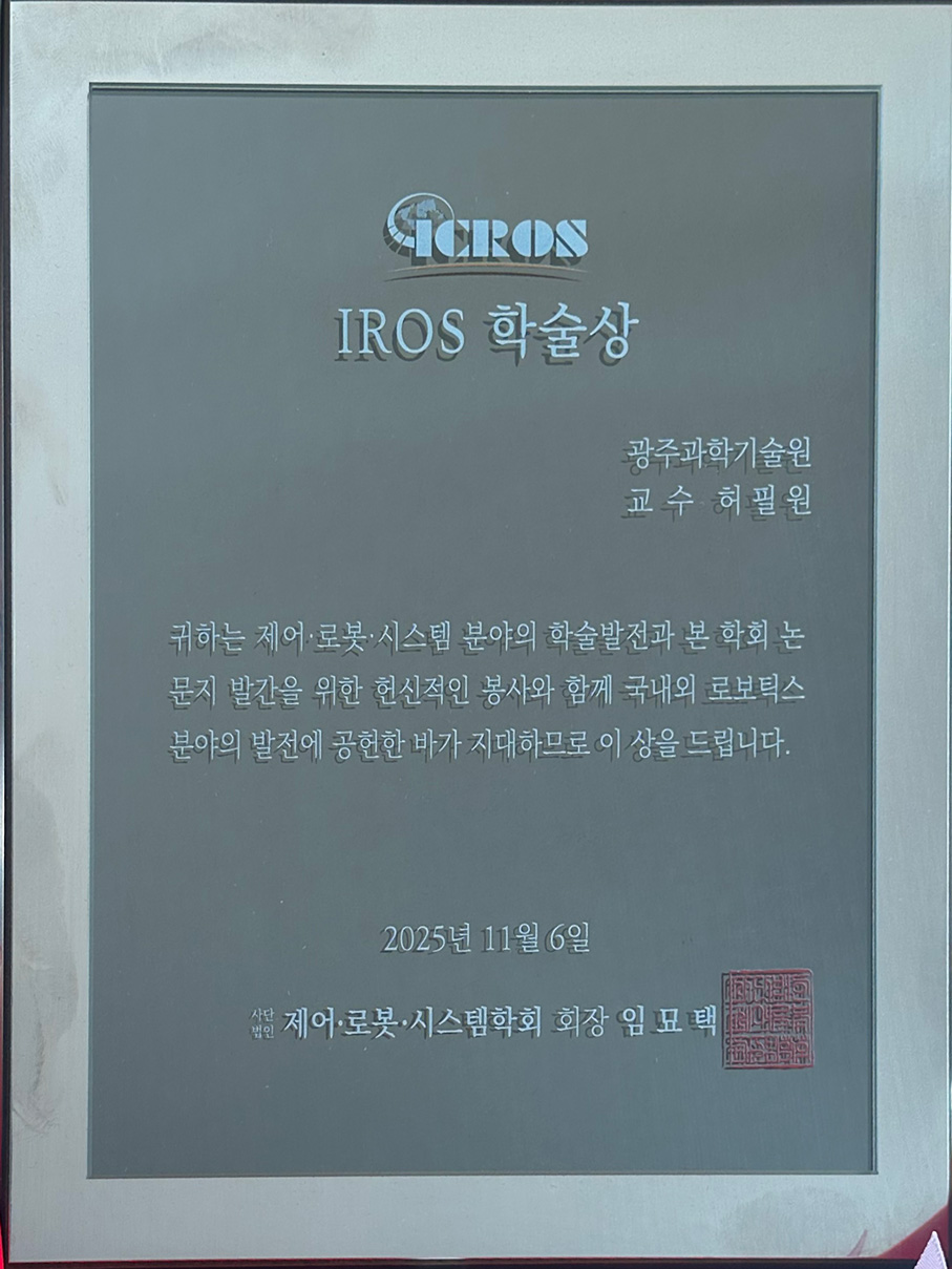 이번 학회에서 가장 기쁜 소식은 바로 허필원 교수의 IROS 학술상 수상입니다!