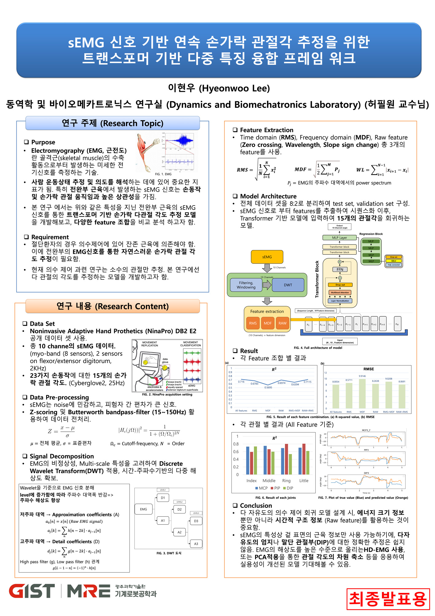 이현우: sEMG 신호 기반 연속 손가락 관절각 추정을 위한 트랜스포머 기반 다중 특징 융합 프레임워크 — 근전도 신호로부터 손가락 움직임을 정밀하게 예측하는 딥러닝 모델을 개발하였습니다.
